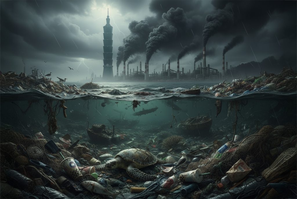 Piece 1 (The Challenge): An ultra-realistic apocalyptic illustration of Taiwan’s coast. Taipei 101 stands isolated under a stormy sky while industrial chimneys belch black smoke. Underwater, a distressed green sea turtle is trapped in nets, surrounded by dense plastic waste, including highly recognizable bubble tea cups. This serves as a stark warning about local consumption habits challenging TCE 6 (Environmental Protection).
