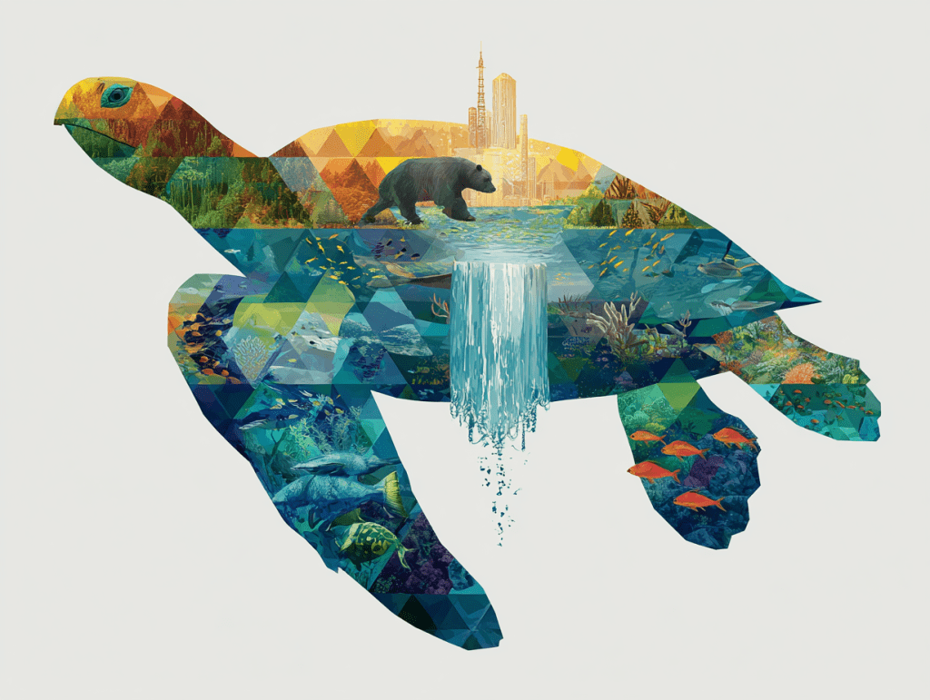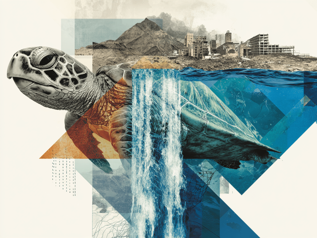 As the water flow reconnects mountains, cities, and oceans within the sea turtle silhouette, it symbolizes the restoration of balance between humanity and nature. With the willingness to change, the flow of life can return to clarity, opening the path toward a sustainable future.